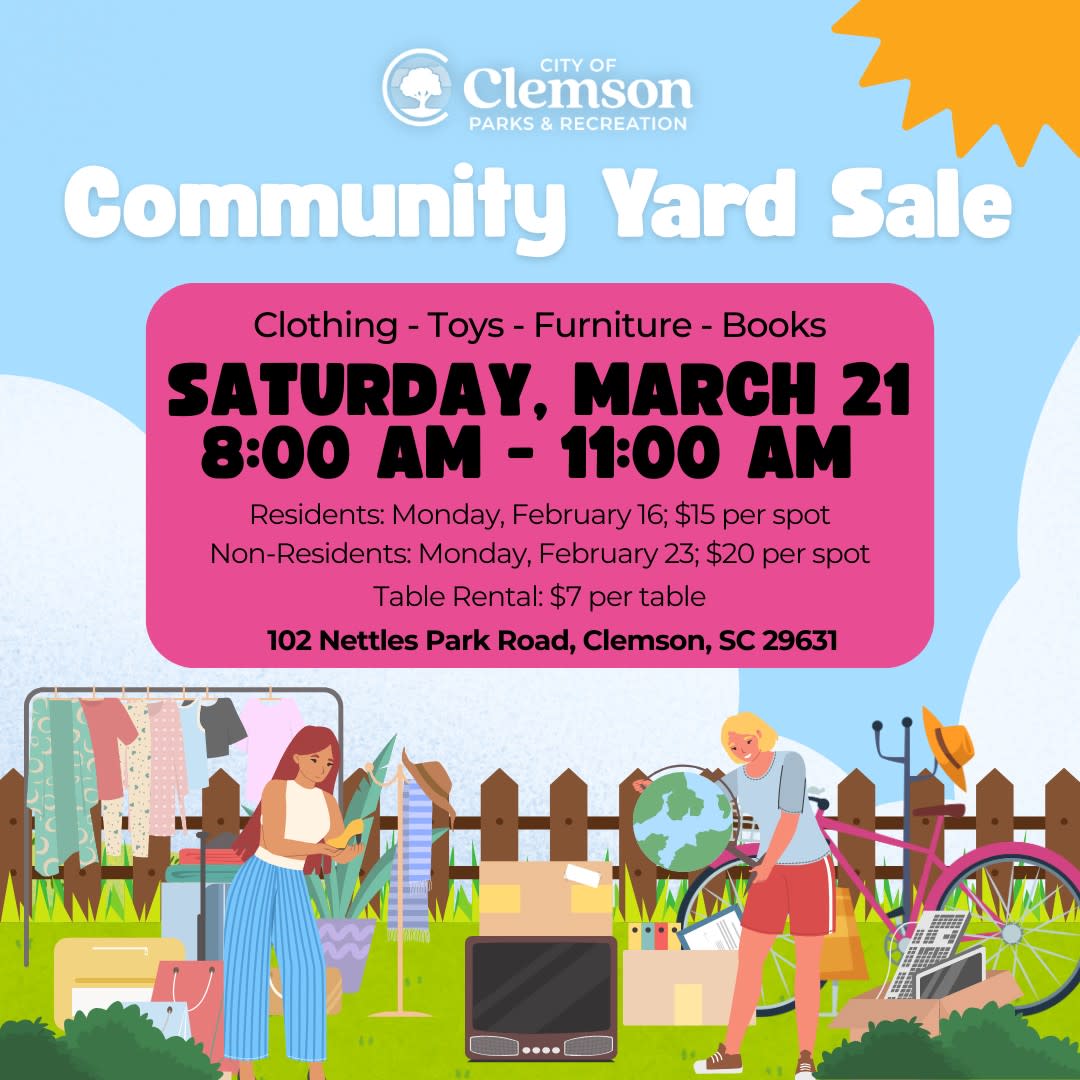 Join the City of Clemson Parks & Recreation for the upcoming Community Yard Sale on Saturday, March 21 from 8:00 AM – 11:00 AM at Nettles Park. Shop a wide variety of items including clothing, toys, furniture, and books while supporting local residents clearing out and cashing in. Whether you’re hunting for hidden treasures or looking to host your own sale, this is a great way to connect with the community and start your Saturday off right.102 Nettles Park Road