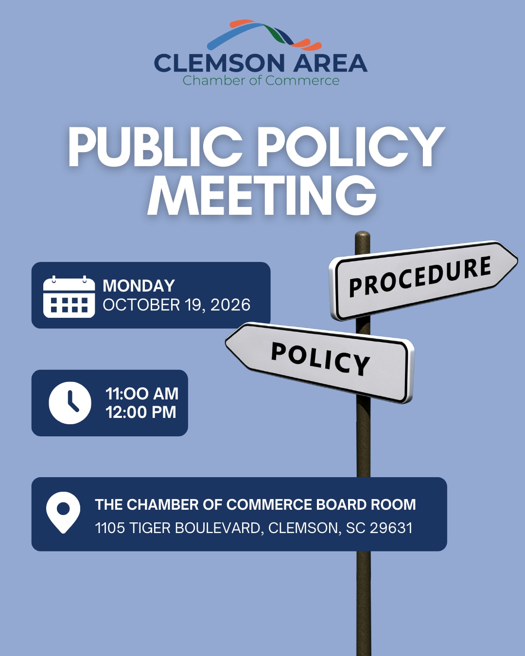 The Public Policy Committee monitors local, state, and federal issues impacting the business community and serves as a forum for discussion, education, and advocacy. Meetings provide updates on legislative activity, local government initiatives, and policy issues affecting Clemson, Central, Pendleton, and Six Mile. Committee members hear from elected officials, community leaders, and subject-matter experts while helping guide the Chamber’s advocacy priorities. Participation is encouraged for members interested in public affairs, economic development, and government relations.Images
